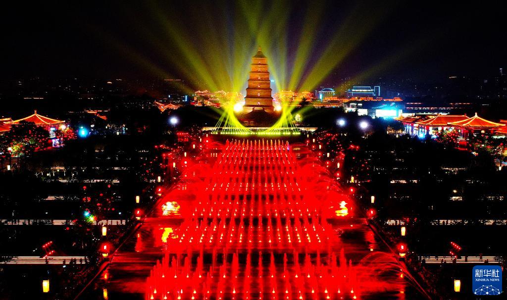 西安大雁塔北廣場(chǎng)在進(jìn)行音樂(lè )噴泉表演(4月18日攝,無(wú)人機照片)。