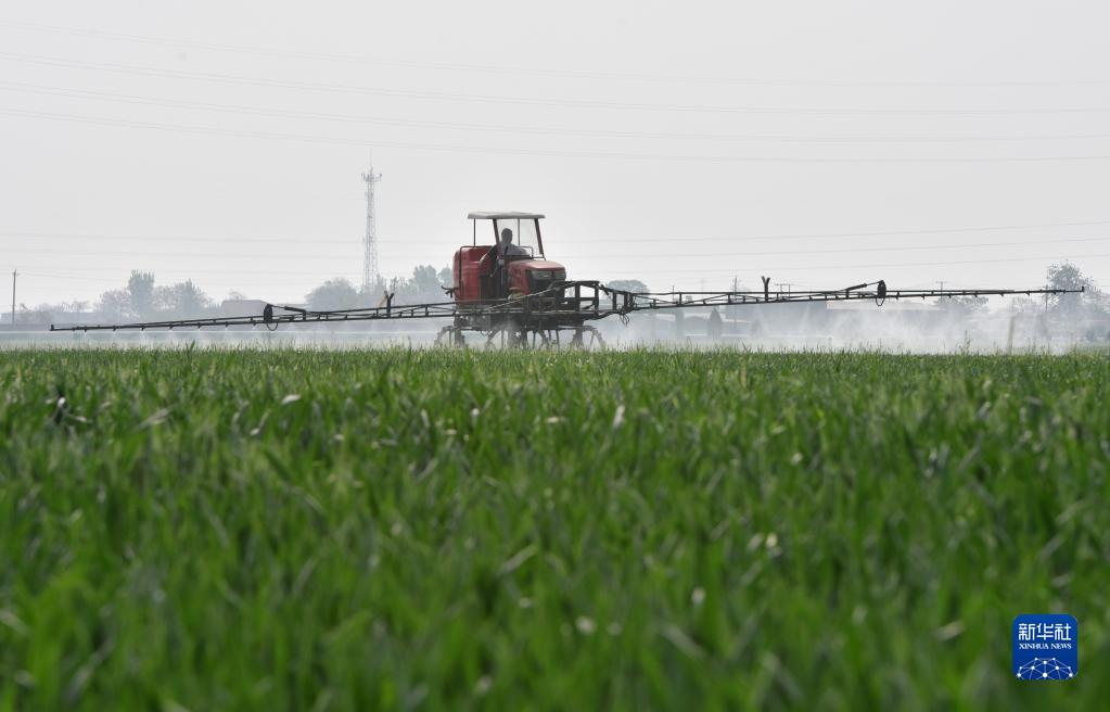 4月19日,河北省邢臺市南和區河郭鎮張相村農民使用農業(yè)機械在麥田噴灑農藥。