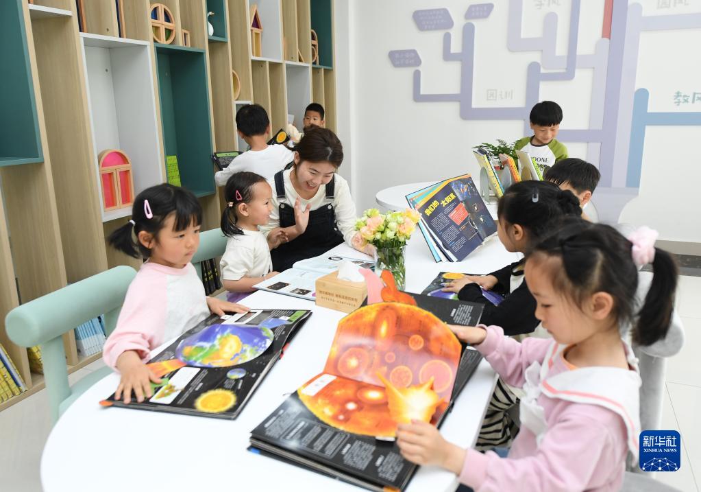 4月19日,吳興區八里店鎮中心幼兒園的老師帶著(zhù)孩子們在書(shū)吧閱讀繪本。