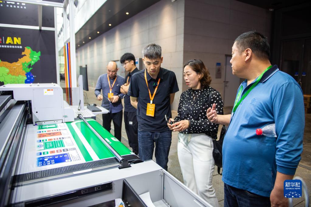 4月19日,在長(cháng)沙國際會(huì )展中心,工作人員(右三)向觀(guān)眾介紹一款交通標識打印設備。