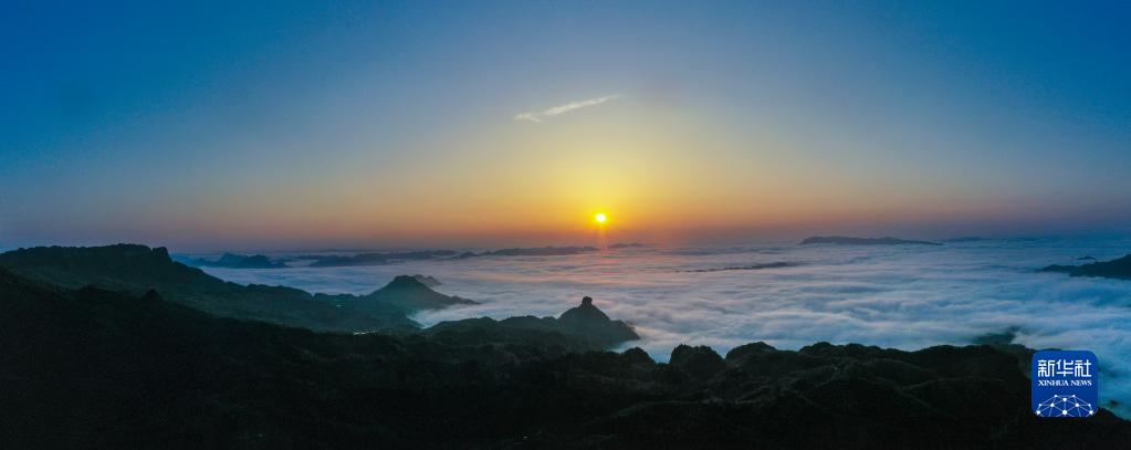 這是4月19日拍攝的金佛山日出時(shí)分的云海景觀(guān)(無(wú)人機拼接照片)。