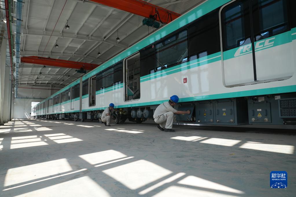 4月19日,在重慶市軌道交通18號線(xiàn)金鰲寺車(chē)輛段,工作人員在對裝配下線(xiàn)的電客車(chē)進(jìn)行檢查。