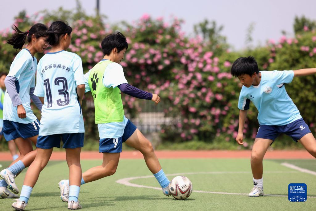 4月19日,在安徽省合肥市裕溪路學(xué)校,女足隊員進(jìn)行足球訓練。