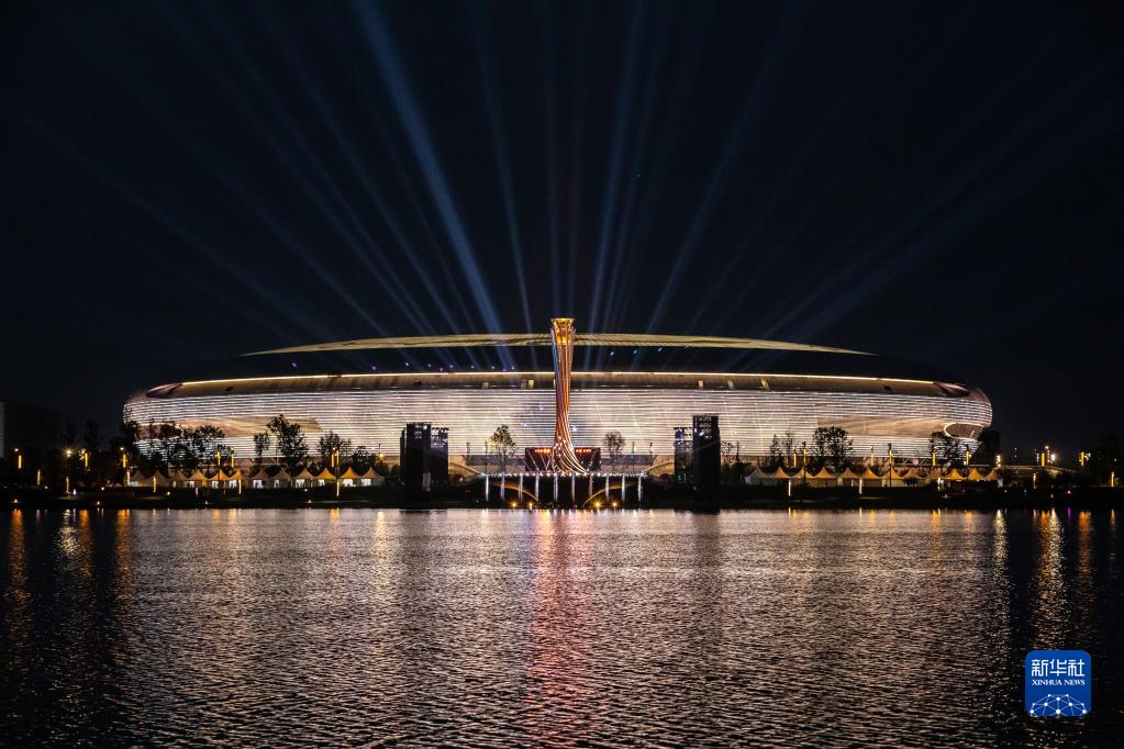 這是4月19日拍攝的第31屆世界大學(xué)生夏季運動(dòng)會(huì )開(kāi)幕式主體育場(chǎng)及主火炬。