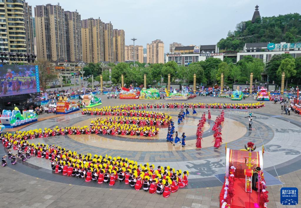 當日,四川省級非遺“興文苗族花山節”展示傳承活動(dòng)在四川省興文縣市民廣場(chǎng)舉行?;顒?dòng)上融入傳統祭祀、農耕文化、民族團結等內容的展演和苗家長(cháng)桌美食宴,讓賓客感受到熱烈的節日氛圍。