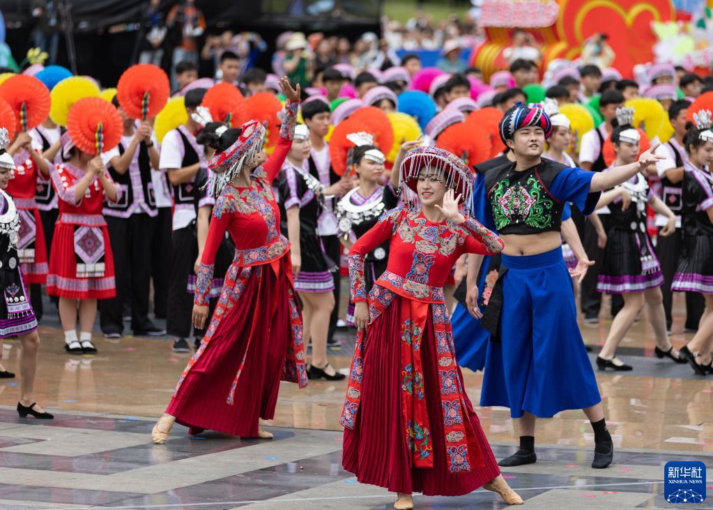 當日,四川省級非遺“興文苗族花山節”展示傳承活動(dòng)在四川省興文縣市民廣場(chǎng)舉行?;顒?dòng)上融入傳統祭祀、農耕文化、民族團結等內容的展演和苗家長(cháng)桌美食宴,讓賓客感受到熱烈的節日氛圍。
