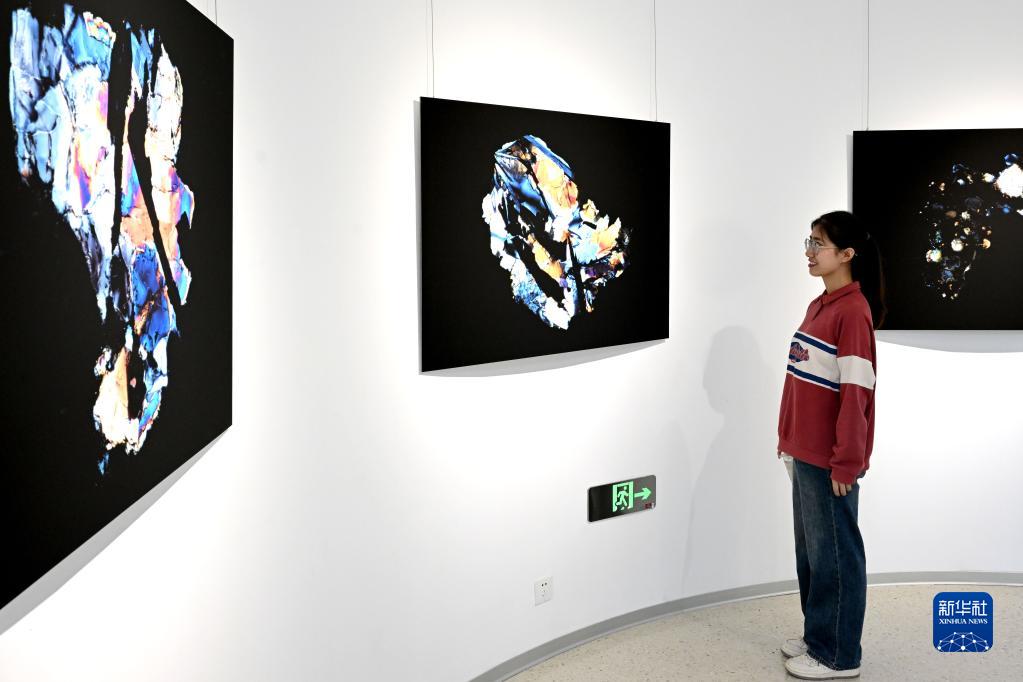 4月19日,觀(guān)眾在展覽上觀(guān)看月壤顆粒正交偏光顯微照片。
