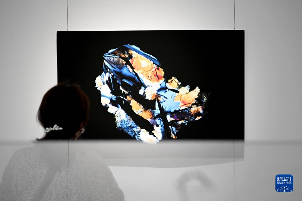 4月19日,觀(guān)眾在展覽上觀(guān)看月壤顆粒正交偏光顯微照片。