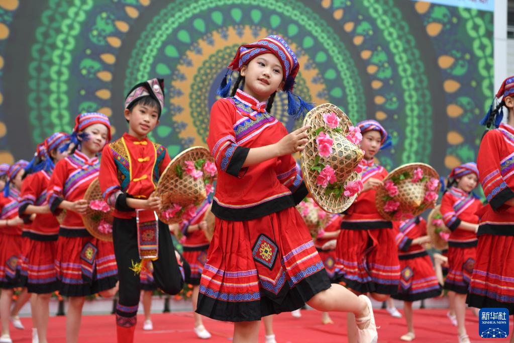 4月20日,孩子們在廣西南寧市逸夫小學(xué)表演民族舞蹈。