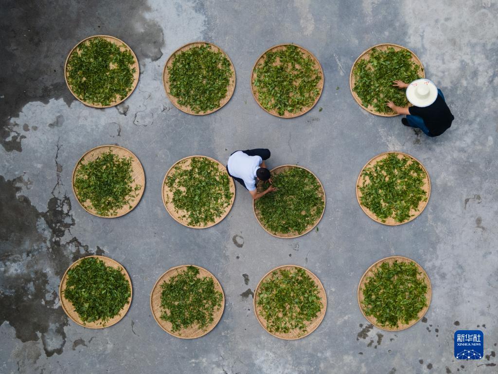 4月19日,制茶工藝傳承人吳科(右)在重慶市南川區德隆鎮茶樹(shù)村和村民晾曬茶葉(無(wú)人機照片)。