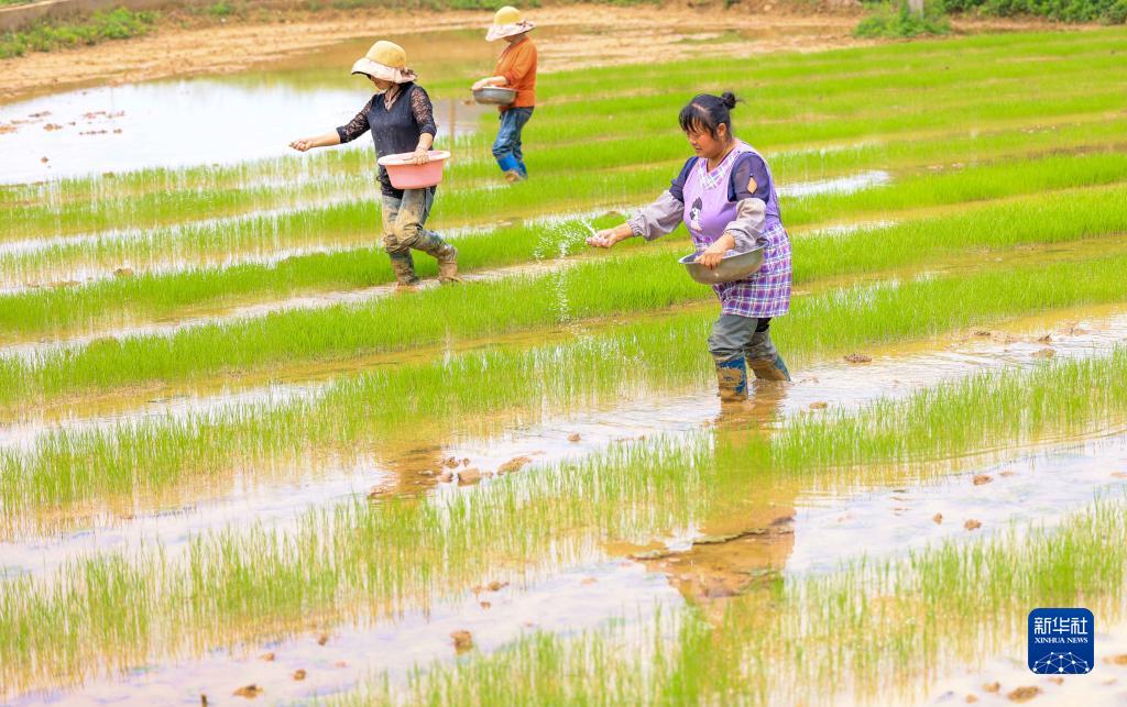 4月20日,農民在貴州省黔東南苗族侗族自治州岑鞏縣大有鎮臘恰畈村給秧苗施肥。