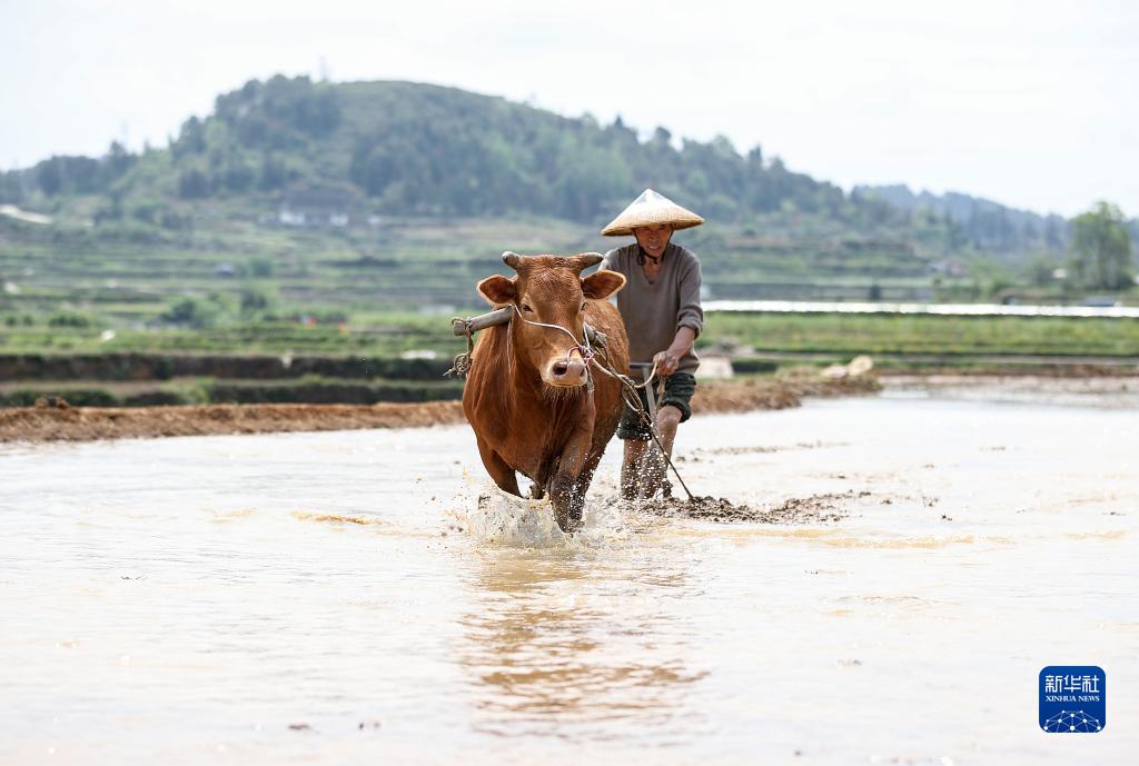 4月20日,貴州省黔東南苗族侗族自治州丹寨縣揚武鎮長(cháng)青社區村民在水田里犁田。