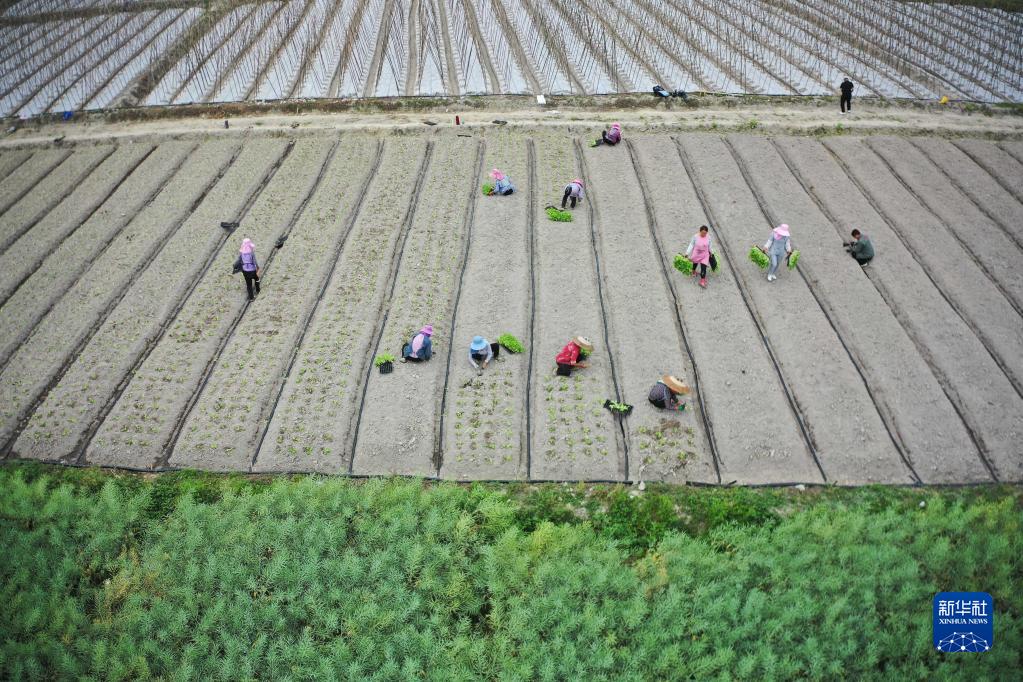 4月20日,村民在貴州省黔東南苗族侗族自治州黃平縣舊州鎮草蘆坪村栽種白菜(無(wú)人機照片)。
