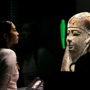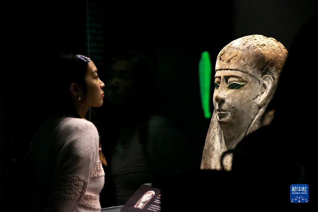 4月20日,觀(guān)眾在展覽上觀(guān)看木乃伊棺蓋。