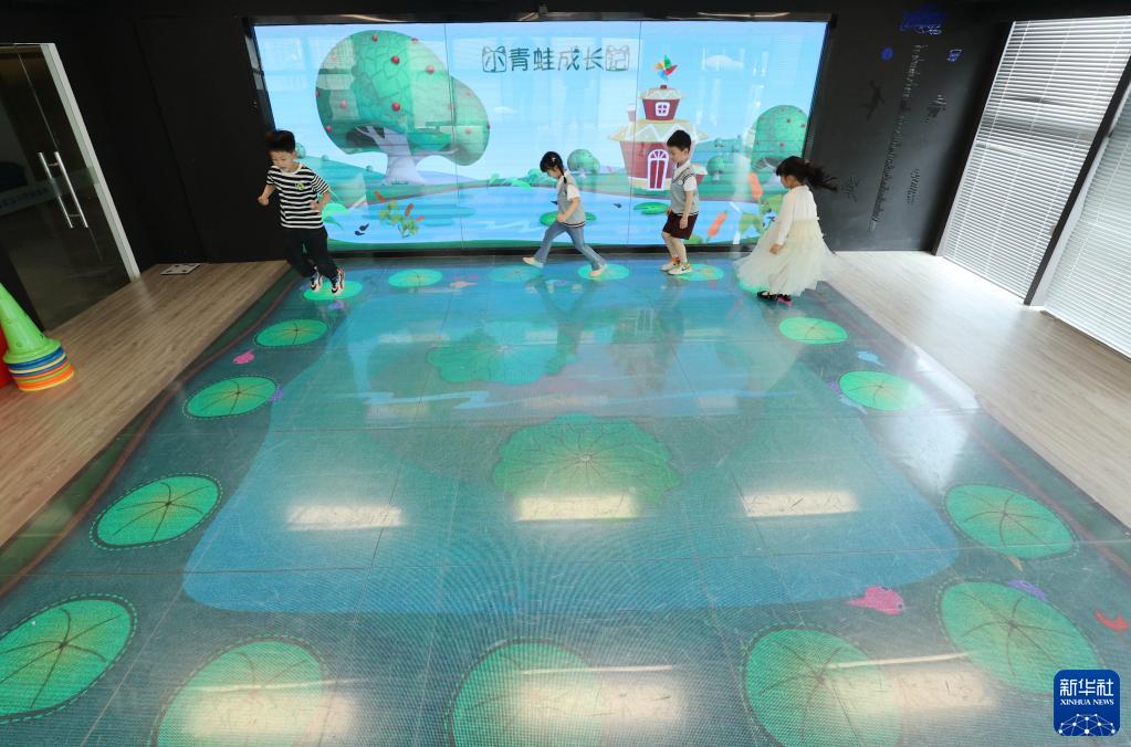 4月20日,在湖州市德清縣舞陽(yáng)街道玉屏未來(lái)社區,小朋友在體驗智能體測游戲。