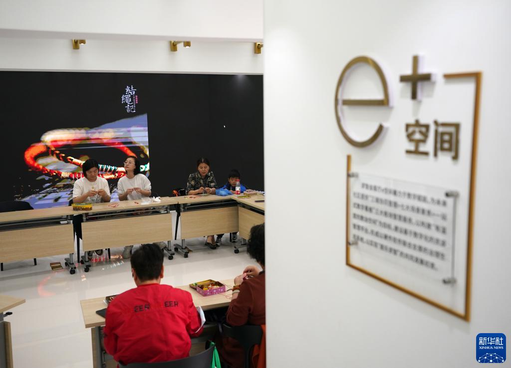 4月20日,杭州市西湖區西溪街道求智未來(lái)社區居民在未來(lái)社區會(huì )客廳內學(xué)習編織。