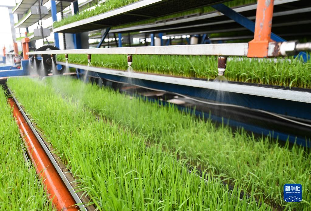 4月20日,在彭山區公義鎮的數智水稻示范基地,循環(huán)式智能育秧機給秧苗補水。