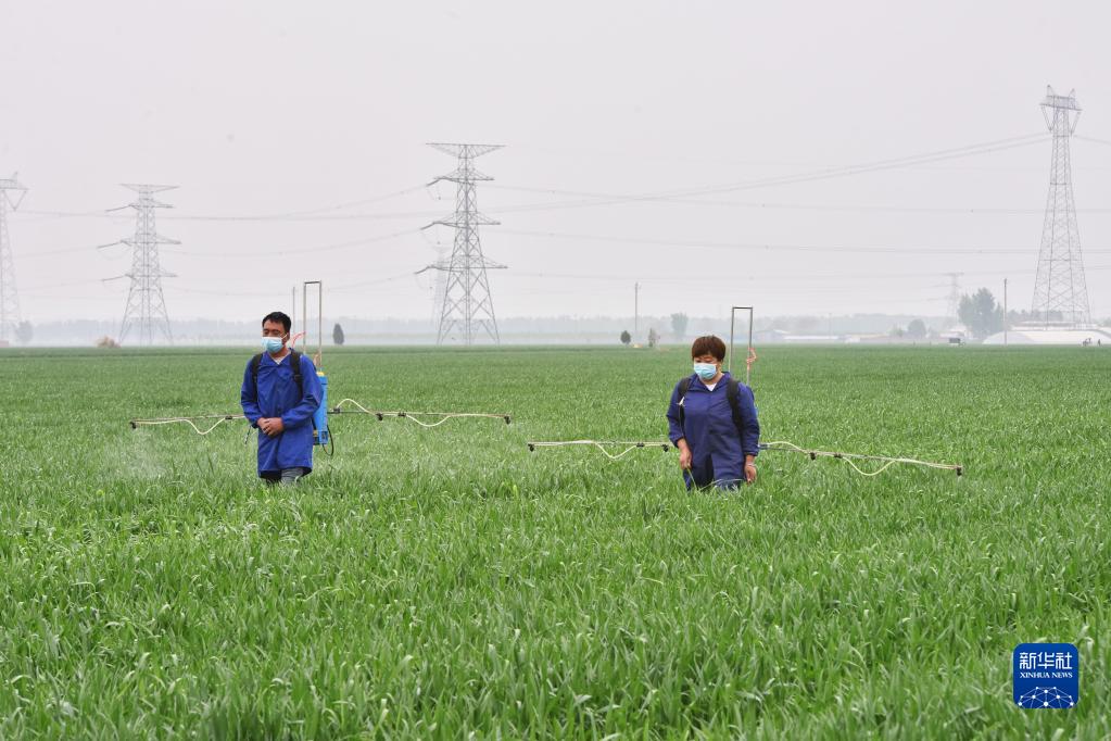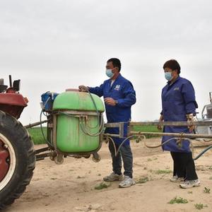 4月20日,張占強夫婦在托管的小地塊麥田進(jìn)行人工噴藥。