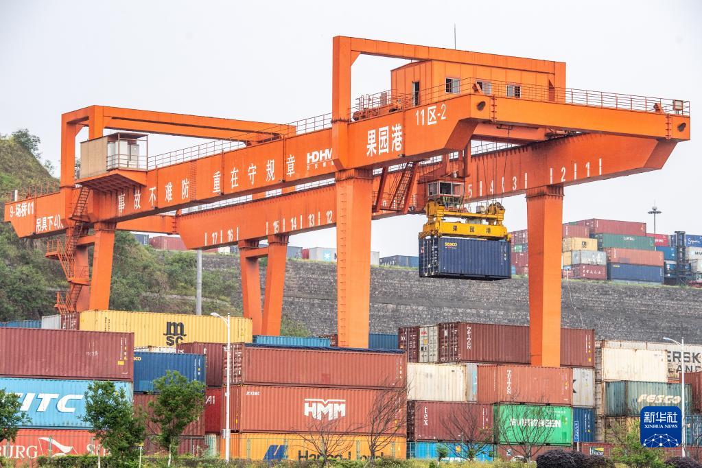 4月20日,在重慶果園港,機械設備在吊裝集裝箱。