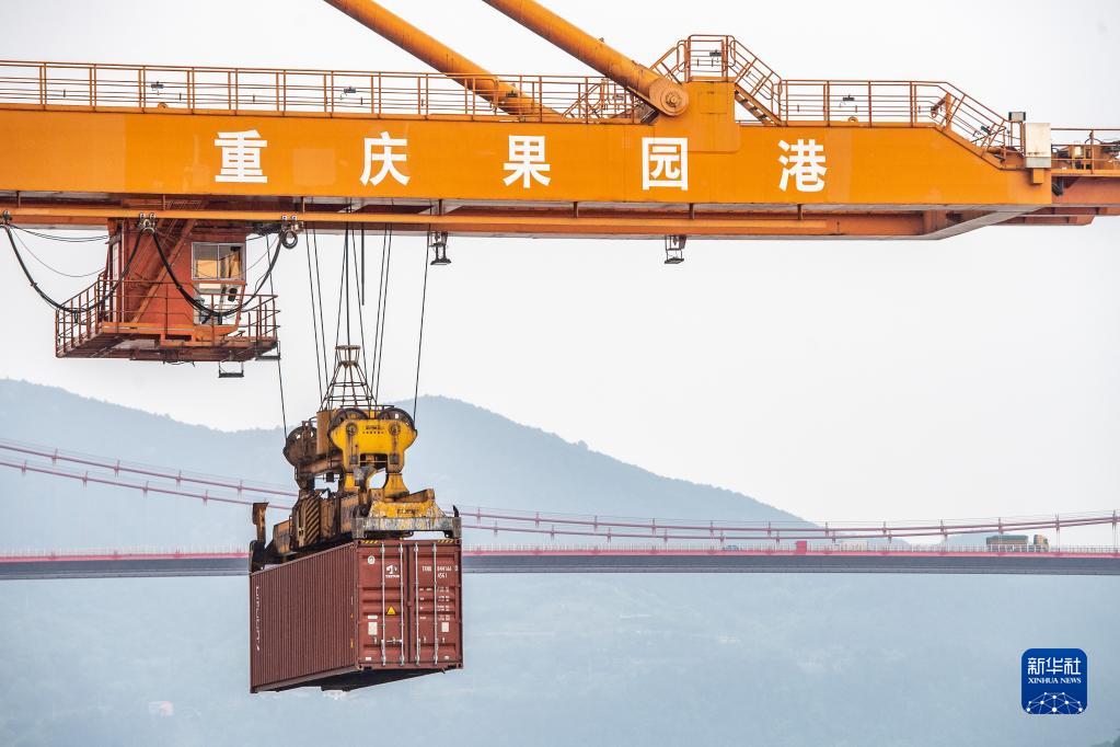 4月20日,在重慶果園港,機械設備在吊裝集裝箱。