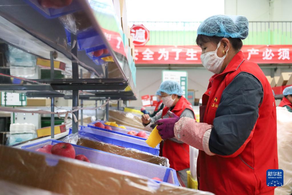 4月20日,工作人員在靜寧縣德美冷鏈物流產(chǎn)業(yè)園分揀蘋(píng)果。