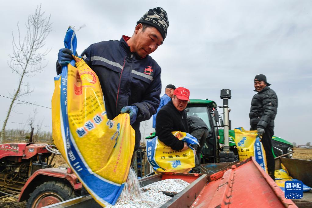 4月20日,在吉林省公主嶺市秦家屯鎮王家窩堡村,農民向農機中添加肥料。