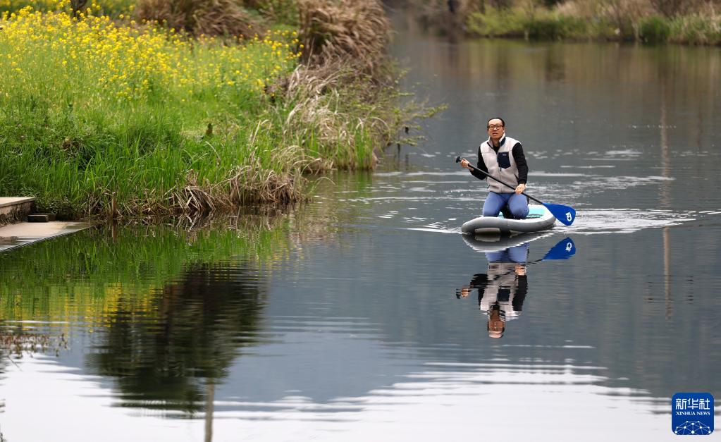 劉龍在民宿前的小河中劃槳板(3月29日攝)。