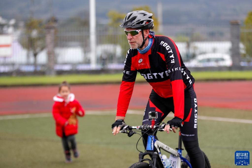 阿明在2023中國黃山(黟縣)國際自行車(chē)公開(kāi)賽男子山地賽公開(kāi)組比賽前(3月25日攝)。