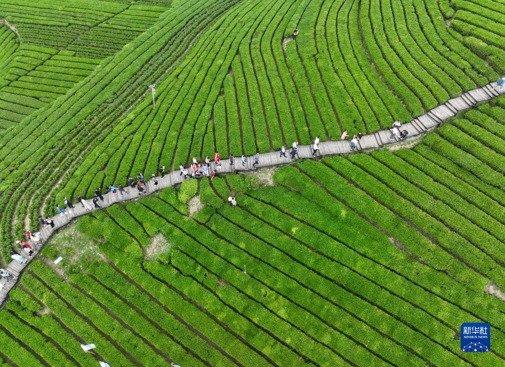 4月21日,游客在宣恩縣伍家臺村茶園游覽(無(wú)人機照片)。