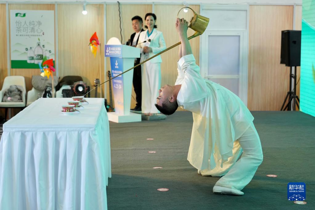 4月21日,在北京茶博會(huì )“春茶臨京城 共品非遺茶”活動(dòng)上,工作人員表演長(cháng)嘴壺技藝。