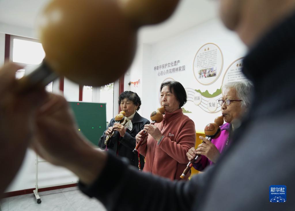 4月21日,秦皇島市北戴河區安居社區幾位老年人在日間照料服務(wù)中心練習演奏葫蘆絲。