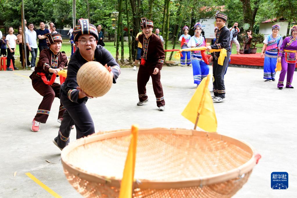 4月21日,在羅城縣米椎林景區,人們參加仫佬竹球比賽。