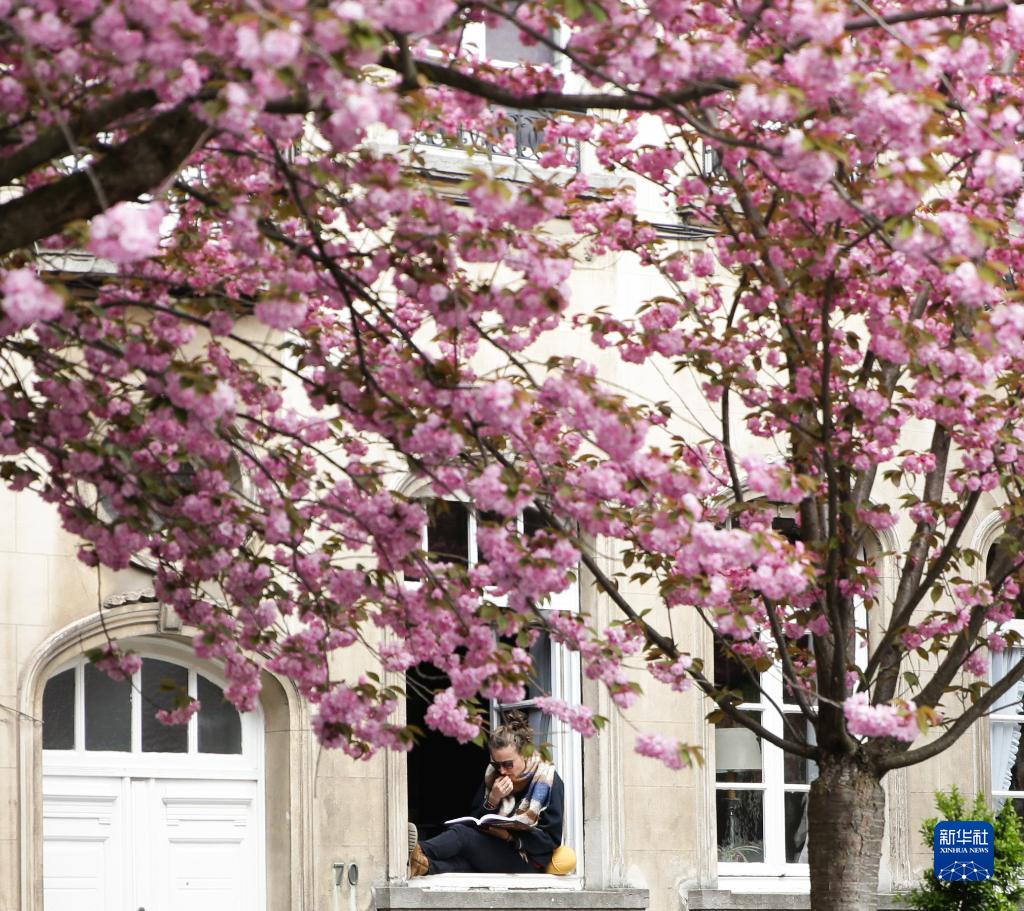 4月18日,在比利時(shí)布魯塞爾櫻花盛開(kāi)的街道邊,一名女子坐在窗臺上讀書(shū)。