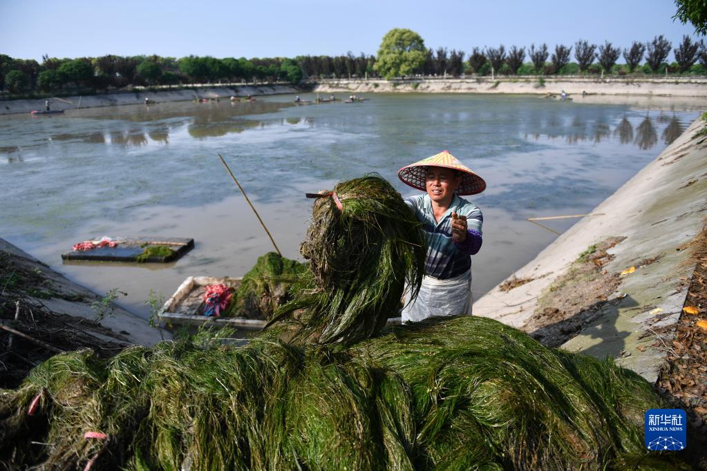 4月20日,工人在大通湖水生植物產(chǎn)業(yè)示范園內采收水草。