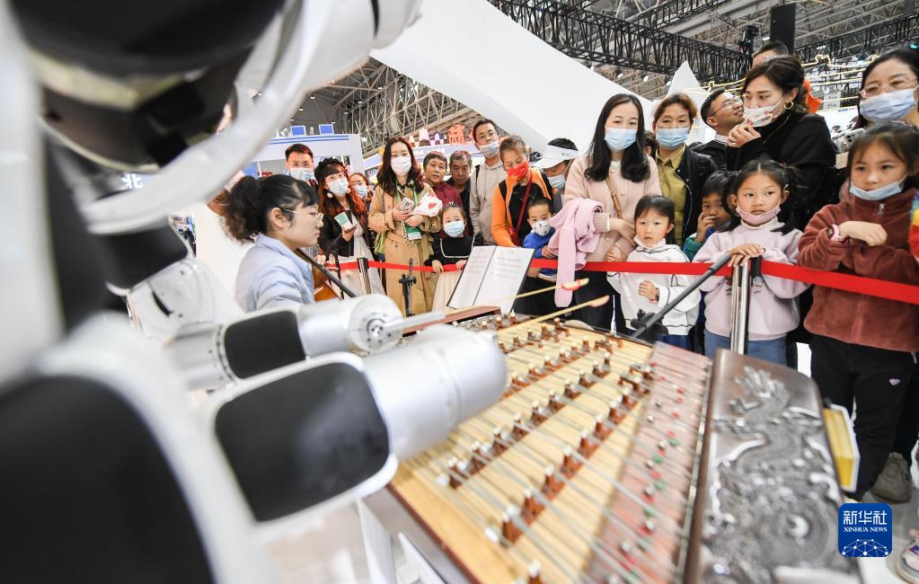 4月22日,觀(guān)眾在博覽會(huì )上觀(guān)看一臺機器人與真人合奏表演。