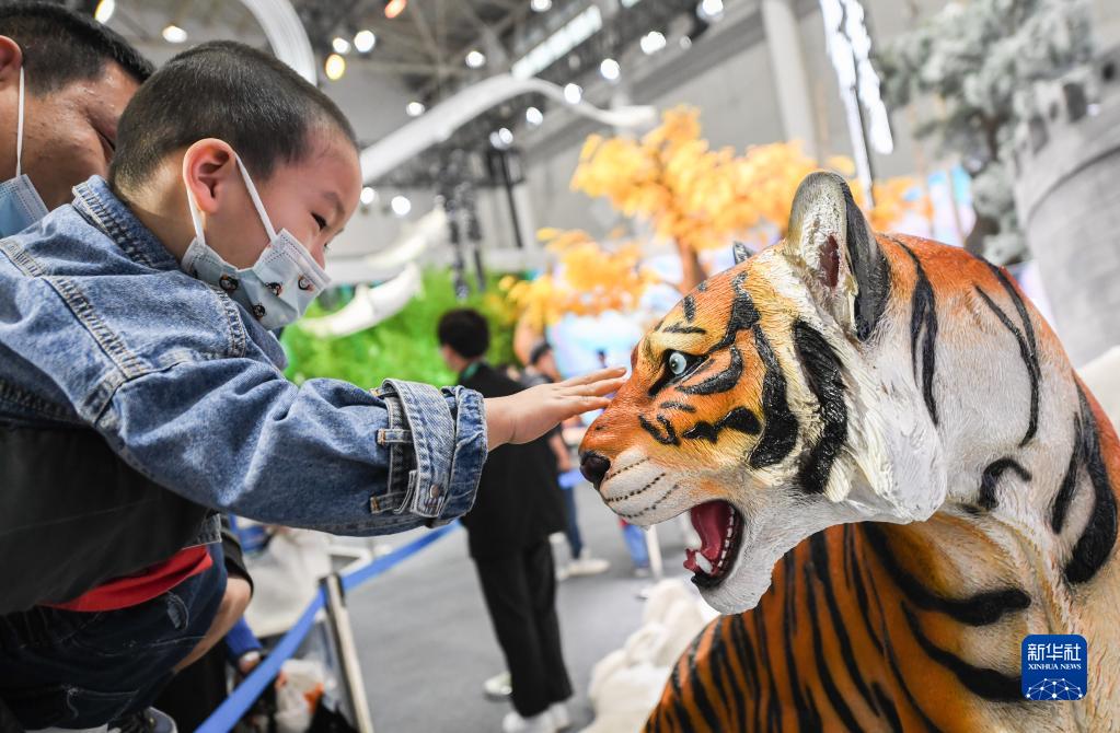 4月22日,一名小朋友在博覽會(huì )上觸摸老虎模型。
