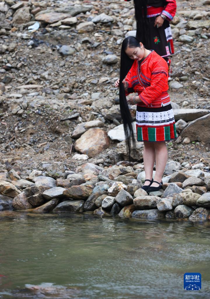 當日是農歷三月初三,廣西桂林市龍勝各族自治縣黃洛瑤寨舉行“三月三龍脊長(cháng)發(fā)節”活動(dòng),吸引游客前來(lái)參觀(guān)游覽。黃洛瑤寨的紅瑤族婦女有世代相傳的蓄發(fā)習俗,平均頭發(fā)長(cháng)度達1.7米,最長(cháng)的有2.72米。
