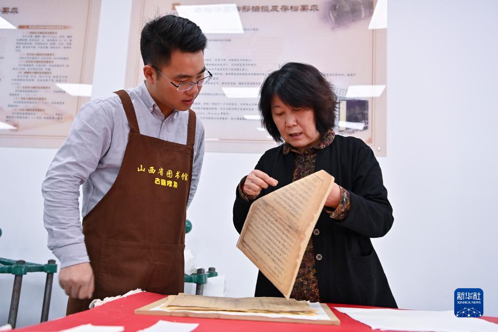 在山西省圖書(shū)館古籍修復中心,程文濤和修復導師邢雅梅(右)交流(4月21日攝)。