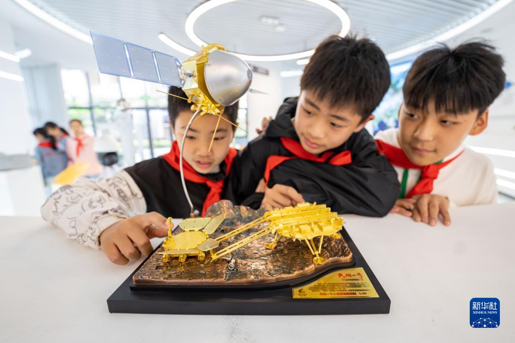 4月21日,在安徽省合肥市肥東縣長(cháng)臨河科創(chuàng )小鎮空間遙感技術(shù)中心,小學(xué)生在觀(guān)看“天問(wèn)一號”火星探測器模型。