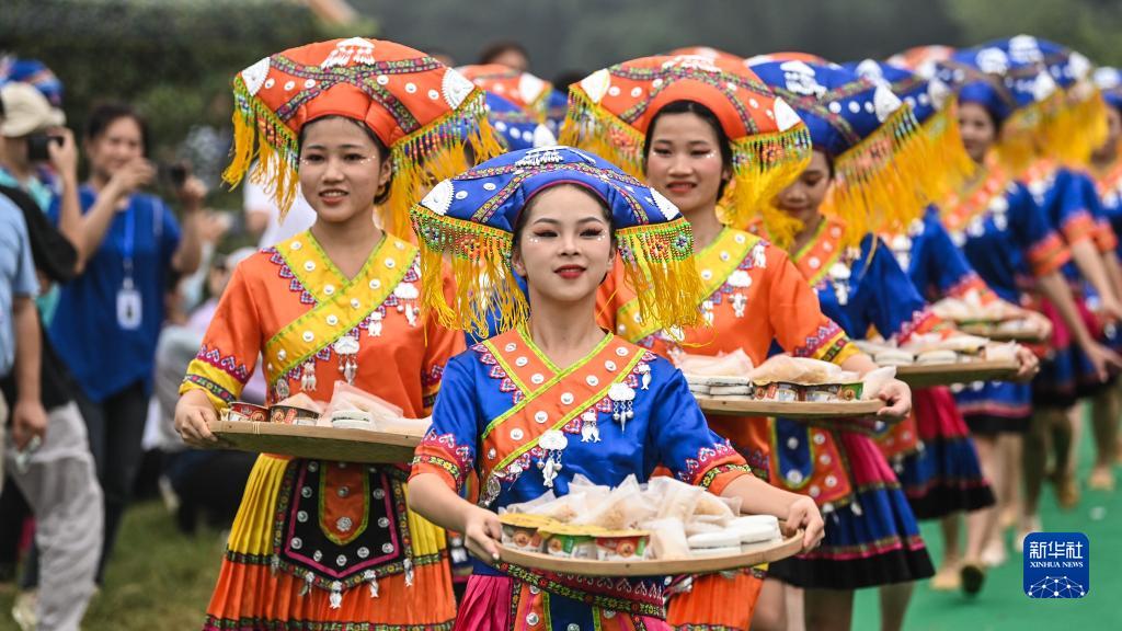 4月22日,一群少女在實(shí)景演出現場(chǎng)手拿美食分發(fā)觀(guān)眾品嘗。