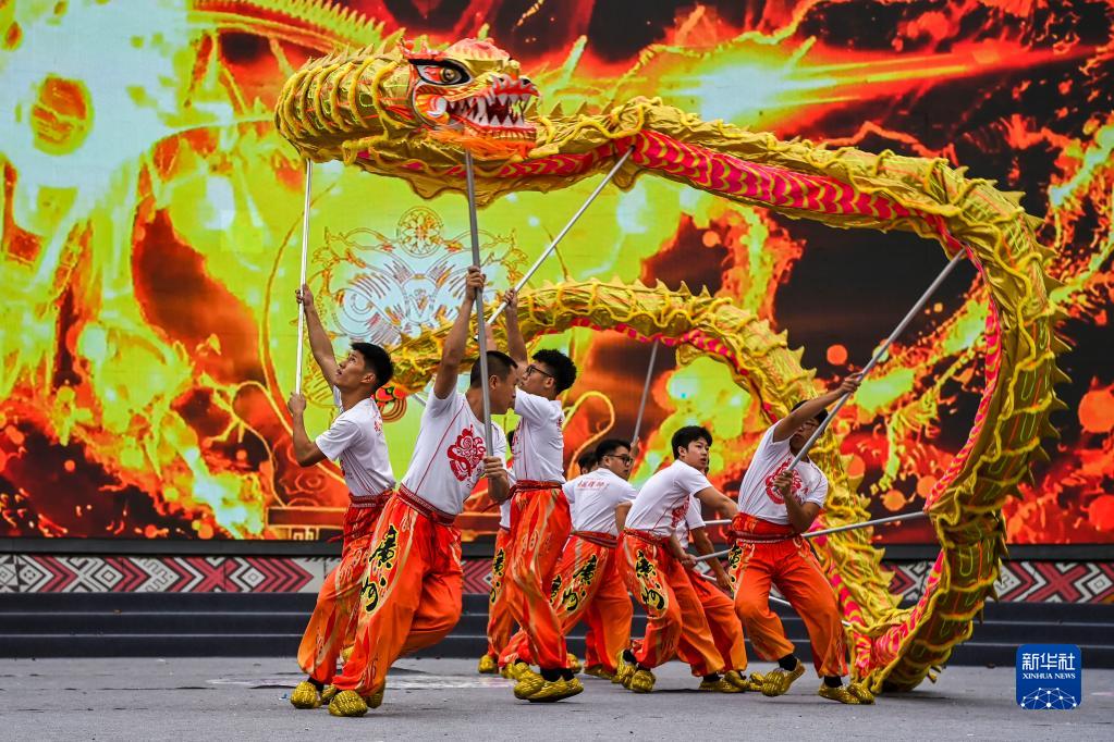 4月22日,在中國—東盟(南寧)非物質(zhì)文化遺產(chǎn)周開(kāi)幕現場(chǎng),演員在表演舞龍。