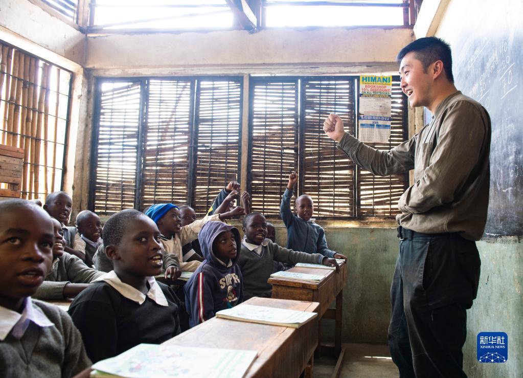 4月19日,在肯尼亞內羅畢馬薩雷貧民區的一所小學(xué),劉宜孟翰在讀書(shū)活動(dòng)后為孩子們鼓勁加油。