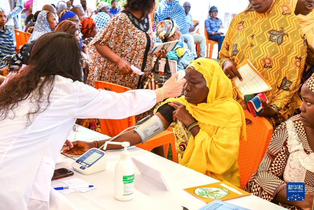 4月20日,醫療隊成員在喀麥隆首都雅溫得的義診活動(dòng)現場(chǎng)為病患測量血壓和體溫。