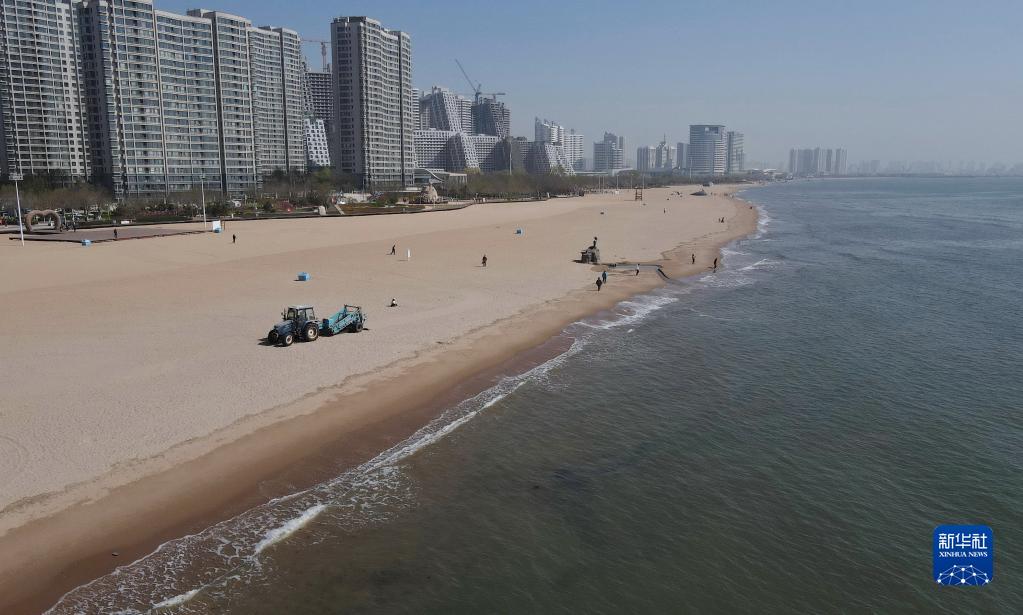 4月23日,工人在秦皇島市海港區金夢(mèng)海灣浴場(chǎng)使用機械設備過(guò)濾海灘上的沙子(無(wú)人機照片)。