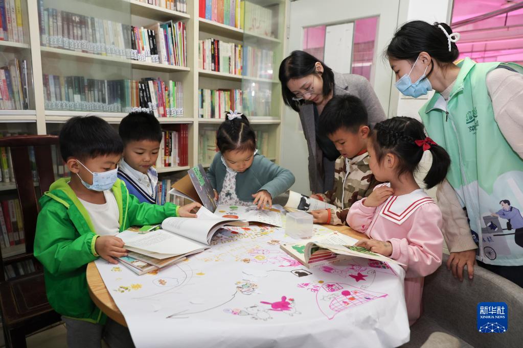 4月22日,在車(chē)站北菜市場(chǎng)的書(shū)屋,攤主和周邊居民的孩子們在志愿者帶領(lǐng)下參與“世界讀書(shū)日”活動(dòng)。