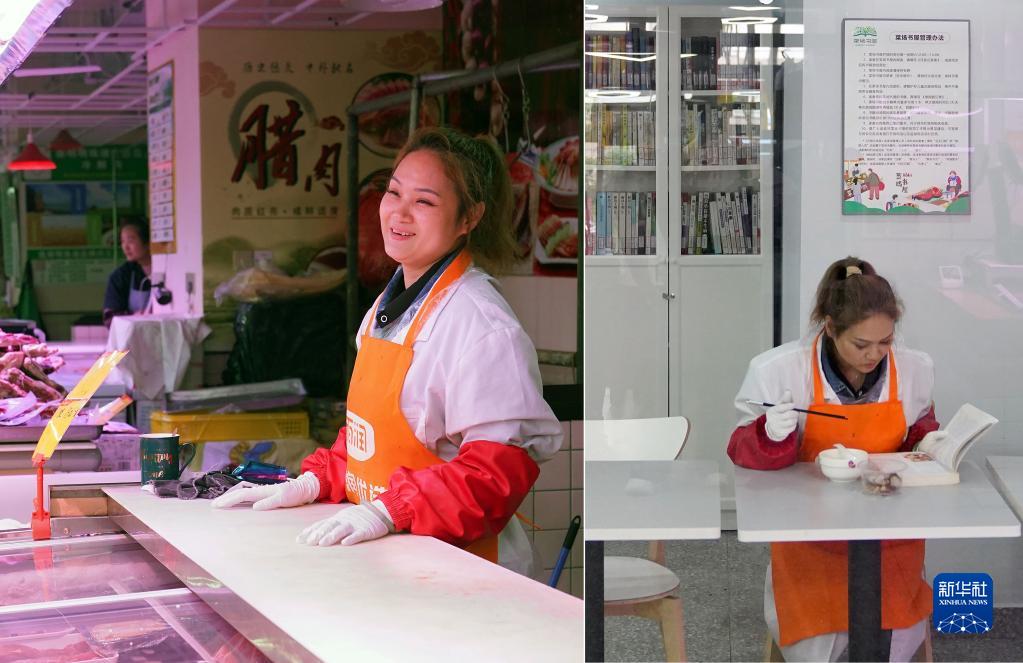 拼版照片:左圖為奎照路菜市場(chǎng)的豬肉經(jīng)營(yíng)戶(hù)陳海燕在和顧客打招呼;右圖為午飯時(shí)陳海燕在菜場(chǎng)書(shū)屋里翻閱圖書(shū)(4月20日攝)。