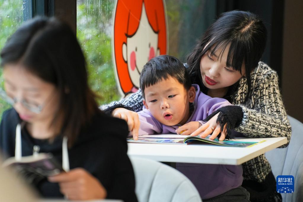 4月23日,在浙江省湖州市德清縣鐘管鎮“干山小鎮農家書(shū)屋”,一名小朋友在大人的陪伴下讀書(shū)。