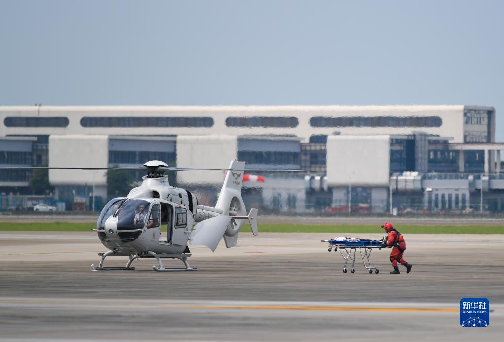 4月23日,在深圳機場(chǎng)舉行的演練中,急救人員模擬將受傷的乘客運往急救直升機。