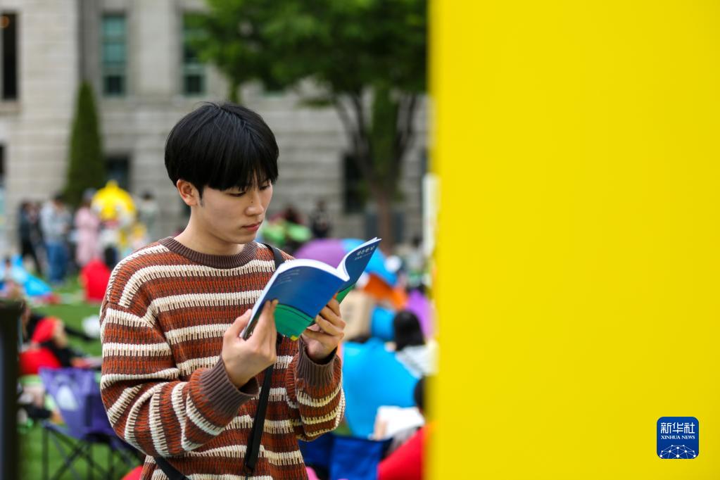 4月23日,一名男子在韓國首爾廣場(chǎng)上閱讀圖書(shū)。