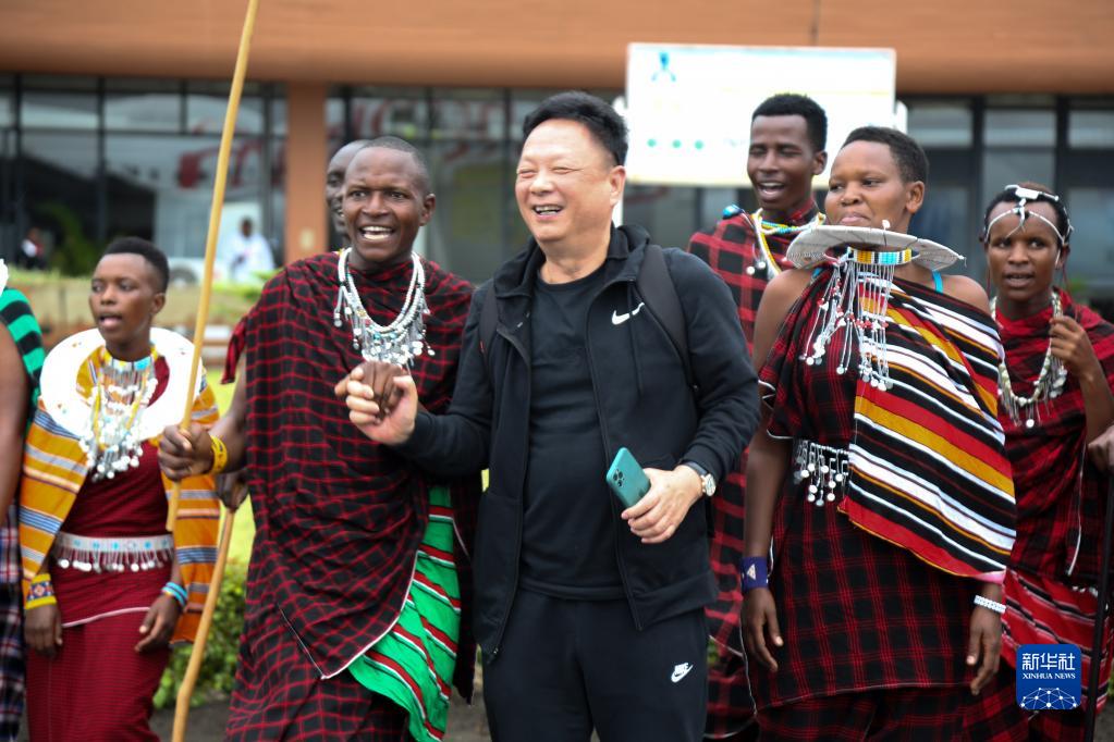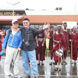 4月22日,在坦桑尼亞乞力馬扎羅國際機場(chǎng),中國游客與身著(zhù)坦桑尼亞傳統服飾的當地人合影。